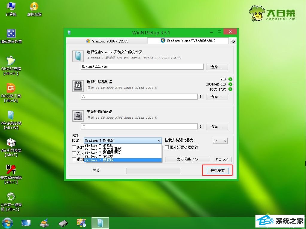 11、引导驱动器和安装磁盘的位置都是C盘,版本下拉框选中要安装的版本,比如windows7旗舰版,然后打开开始安装;